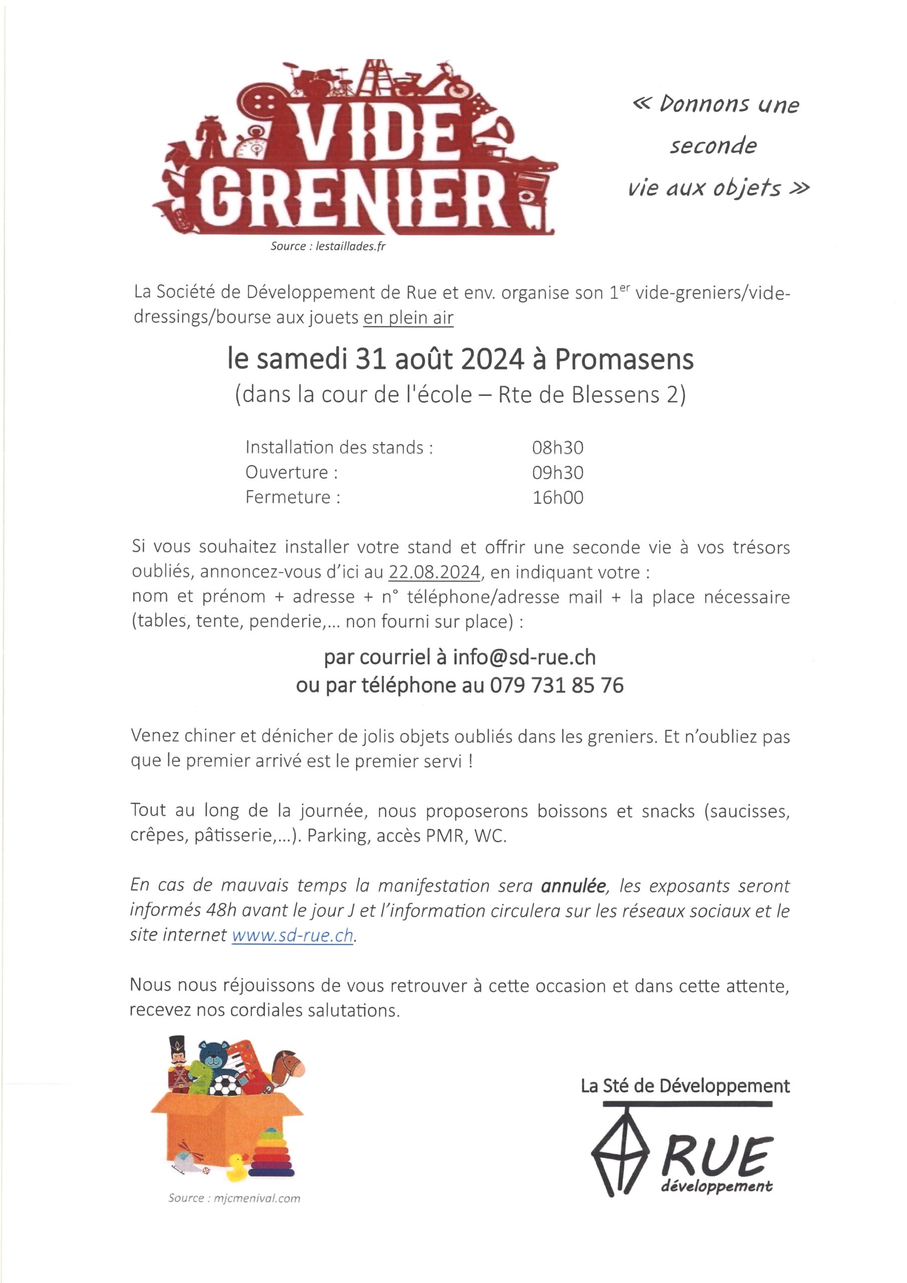 La Société de Développement de Rue et env. organise son 1er vide-greniers/vide-dressings/bourse aux jouets en plein air, le samedi 31 août 2024 dans la cour de l’école, rte de Blessens 2 à Promasens.
